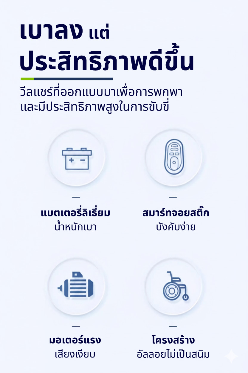 วีลแชร์ไฟฟ้าไม่ได้เป็นเพียงแค่เครื่องช่วยเคลื่อนที่ แต่คือเครื่องมือที่มอบอิสระและความสุขให้แก่คุณ Synergy ECON ได้รับการออกแบบมาเพื่อตอบโจทย์ทุกความต้องการของผู้ใช้งาน ด้วยคุณสมบัติเด่นที่เหนือกว่า: