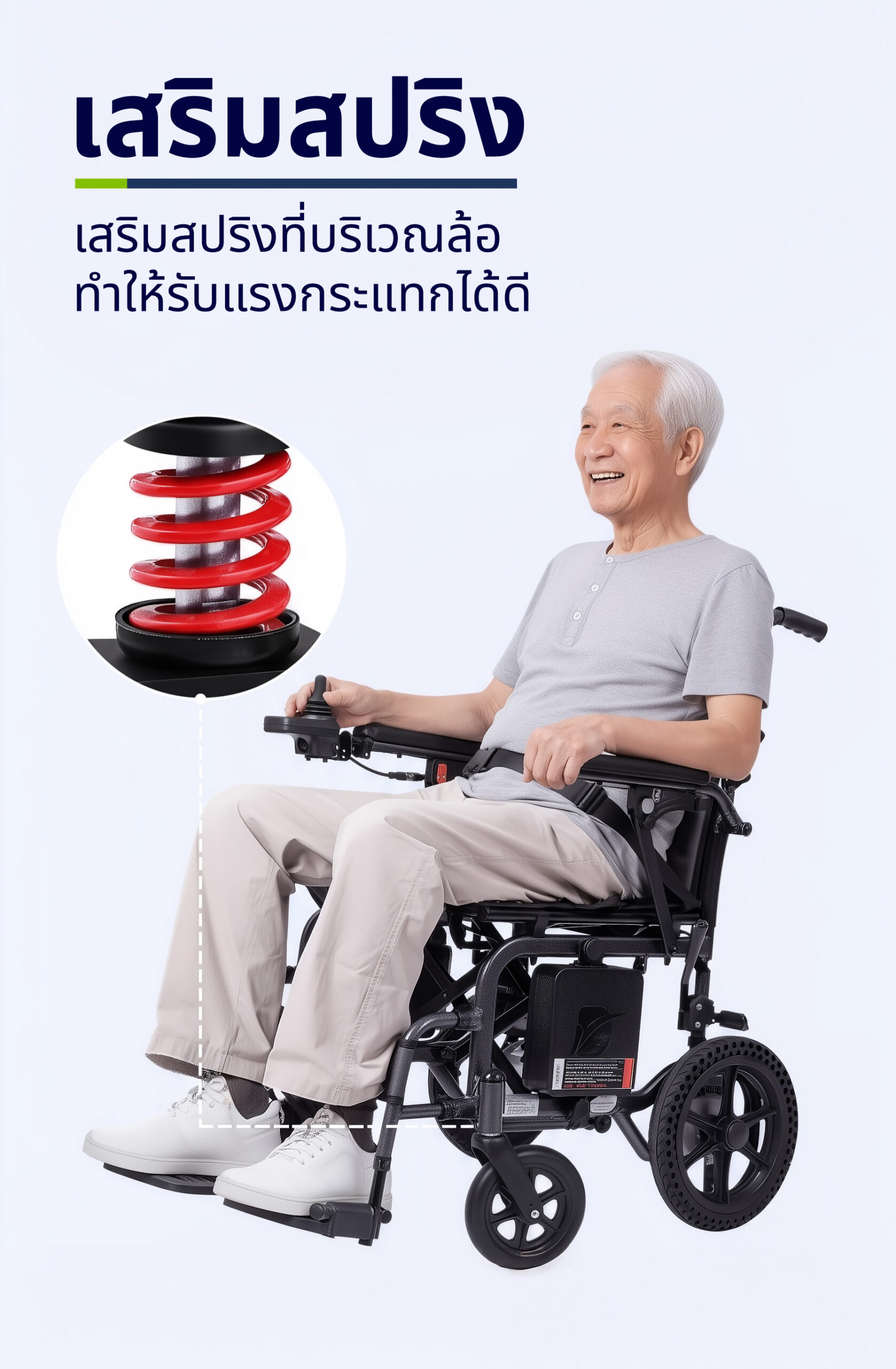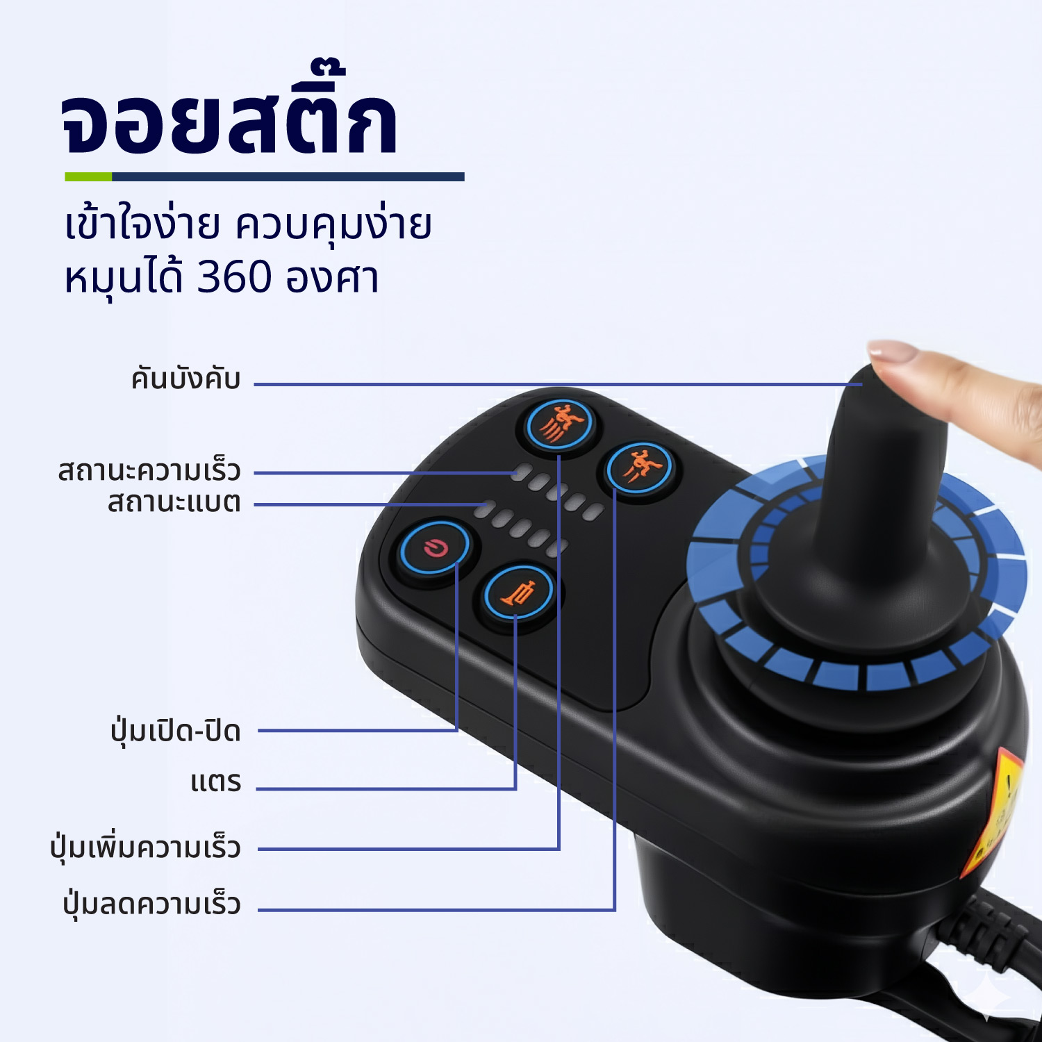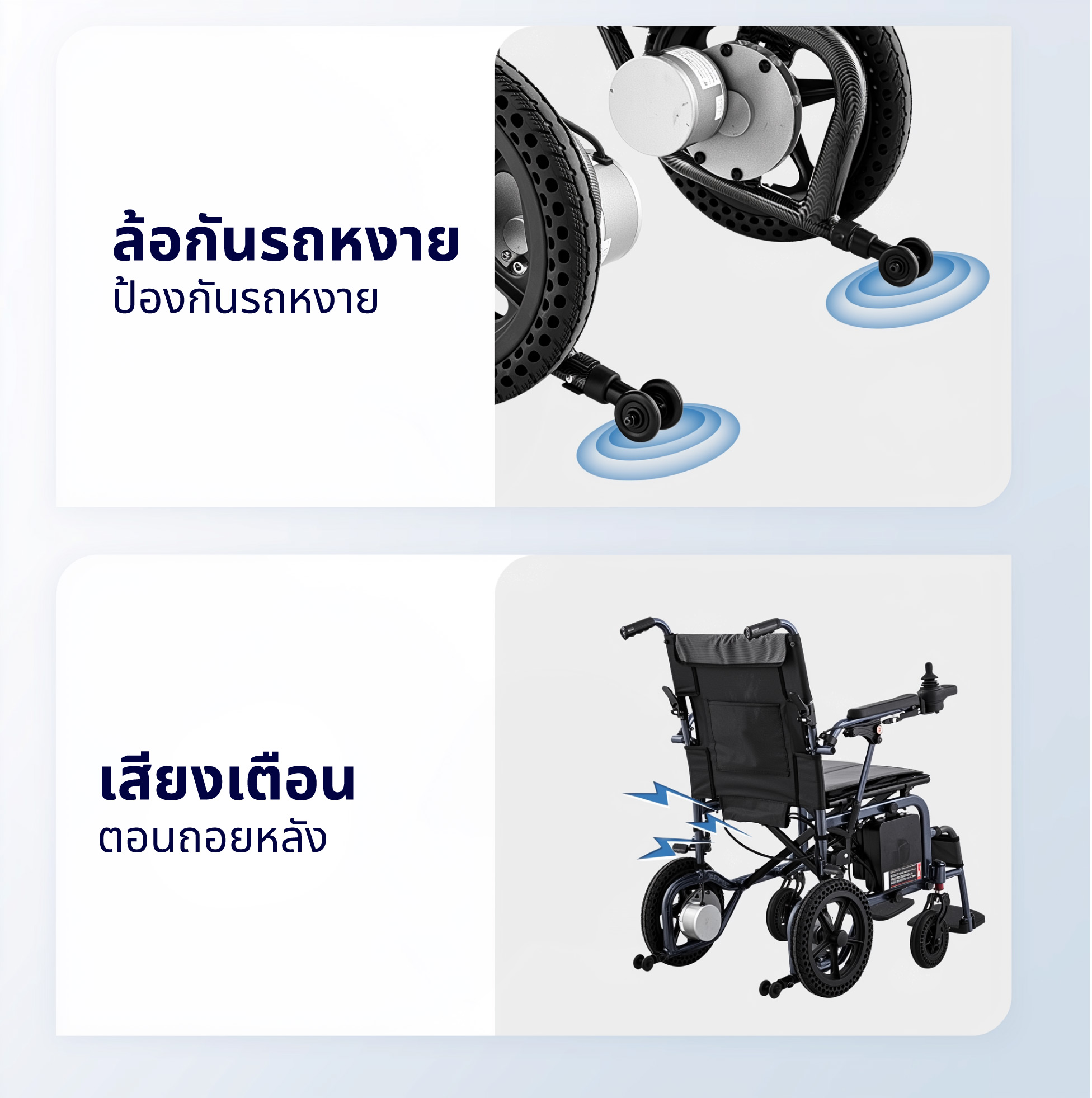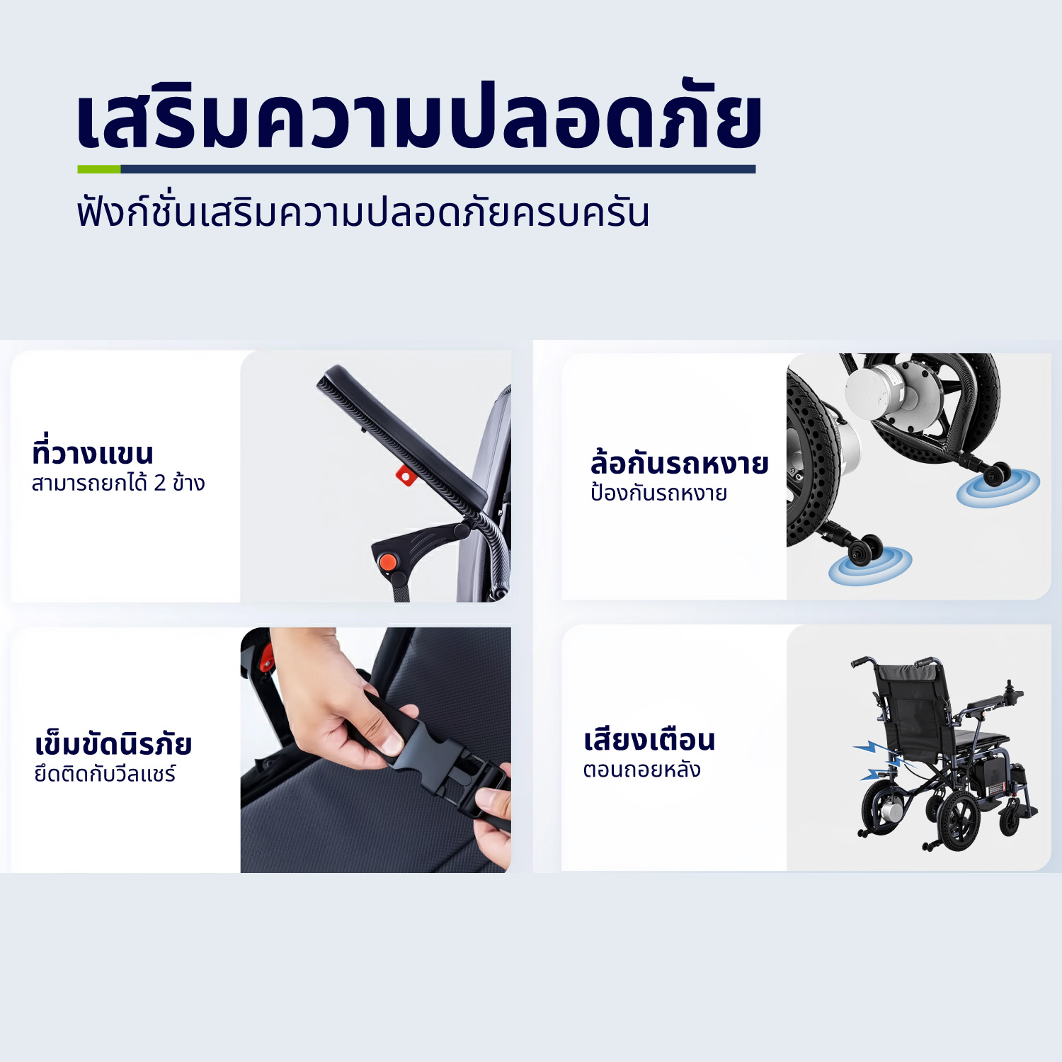 - ความปลอดภัยสูงสุด: วีลแชร์มาพร้อมกับ ระบบเบรกไฟฟ้าอัจฉริยะ (Electromagnetic Brake) ที่จะทำงานทันทีเมื่อคุณปล่อยมือจากจอยสติ๊ก ทำให้รถหยุดนิ่งสนิทและไม่ไหลแม้ในทางลาดชัน เสริมความปลอดภัยด้วย เข็มขัดนิรภัย และ ล้อกันรถหงาย ที่ช่วยป้องกันอุบัติเหตุ
