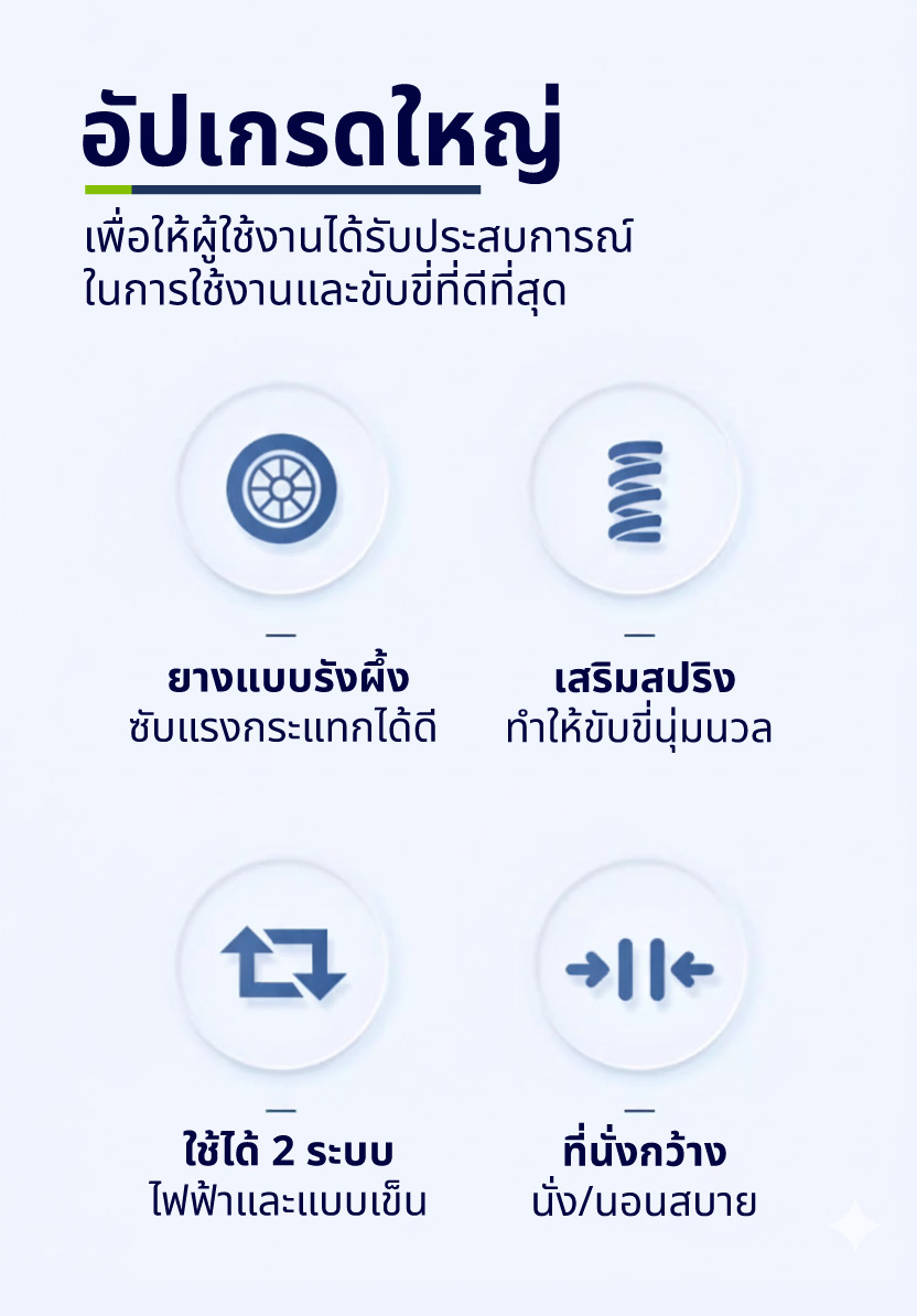 - ระบบเบรกไฟฟ้า: รถหยุดทันทีเมื่อปล่อยมือ ปลอดภัยบนทางลาดชัน