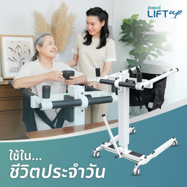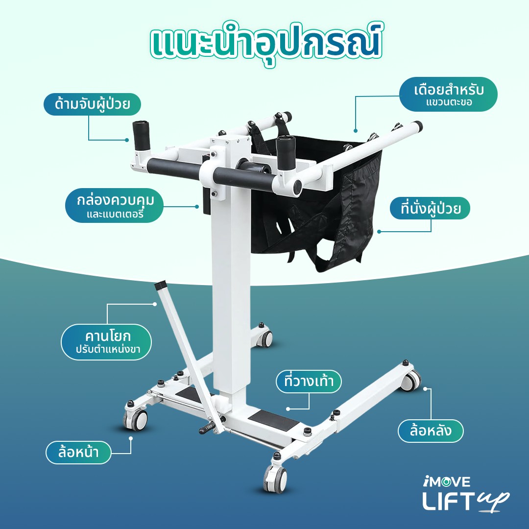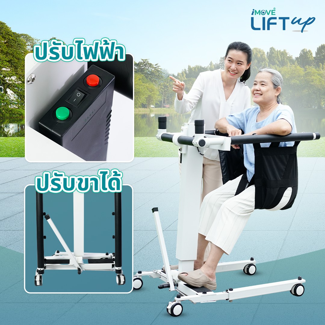 อุปกรณ์เคลื่อนย้ายผู้ป่วยระบบไฟฟ้า iMOVE LIFT UP คือโซลูชั่นที่ออกแบบมาเพื่อลดภาระและเพิ่มความปลอดภัยในการเคลื่อนย้ายผู้สูงอายุหรือผู้ป่วยที่มีปัญหาด้านการเคลื่อนไหว ออกแบบที่นั่งแบบใหม่มาให้ยกผู้ป่วยได้โดยง่าย โดยไม่ทำให้เจ็บก้นหรือเจ็บหลัง มีตัวควบคุม สามารถปรับความสูงที่นั่งขึ้น-ลงด้วยระบบไฟฟ้า ทำให้การย้ายผู้ป่วยจากเตียงไปยังรถเข็น, ห้องน้ำ, โซฟา หรือแม้กระทั่งรถยนต์ เป็นไปอย่างง่ายดาย, นุ่มนวล และลดความเสี่ยงต่อการบาดเจ็บของทั้งผู้ดูแลและผู้ป่วย